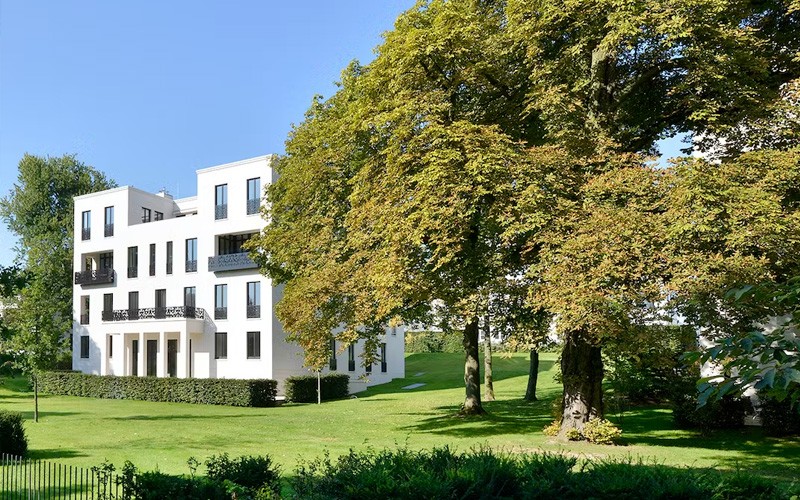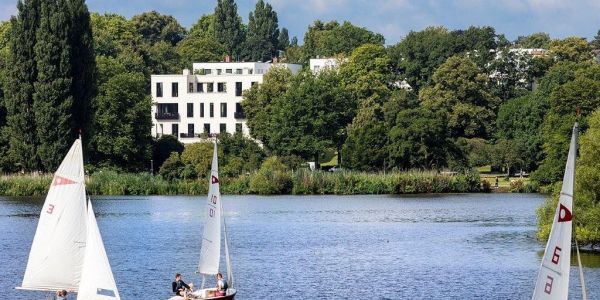 Die Sophienterrassen in Hamburg liegen idyllisch an der Außenalster. Die privilegierte Lage schenkt den Bewohnern nicht nur einen atemberaubenden Ausblick auf die Alster, sondern ermöglicht auch entspannte Momente am nahen Ufer. Die Parkanlage der Sophienterrassen, mit ihrem alten Baumbestand und neu gepflanzten Solitären, geht dabei visuell nahtlos in die öffentlichen Bereiche über. So entsteht eine harmonische Verbindung zwischen urbanem Leben und natürlicher Schönheit.