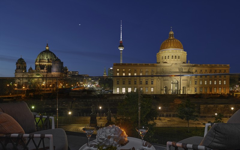 Die Humboldt Lounge eröffnet nicht nur mit seinen Skyframes, drei großen logenartigen Balkons mit Glasbrüstungen einen unvergleichlichen Panorama-Blick über den Spreekanal auf das neue Stadtschloss und den Berliner Dom. Eine Etage höher, in zwei spektakulären Belvederes genießt man die Silhouette des historischen Berlin in einem atemberaubenden 360°-Blick oder den Nachthimmel über Berlin – ein einmaliges Erlebnis. Als besonderes Highlight kann man von hier aus die Außenillumination der Kuppel des neuen Berliner Stadtschlosses ein- und ausschalten.