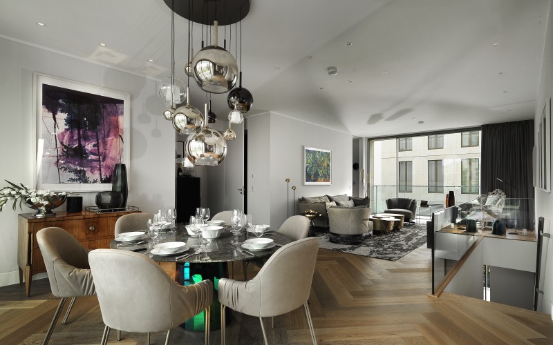Ein Hauch Manhattan umweht den Düsseldorfer Medienhafen in Düsseldorf mit seiner charakteristischen und abwechs­lungs­reichen Skyline. Was lag da näher, als für das einzige Wohn­gebäude an dieser Stelle auch voll eingerichtete Apartments mit Services und Annehmlichkeiten zu kombinieren, wie man das eben aus New York kennt? Neben dem kosmopolitischen Design der Wohnung genießen Bewohner hier auch die Möglichkeiten einer Private Lounge, eines Fitnessbereiches, hauseigener Gas­tronomie, eines Dachgartens und eines Concierges.